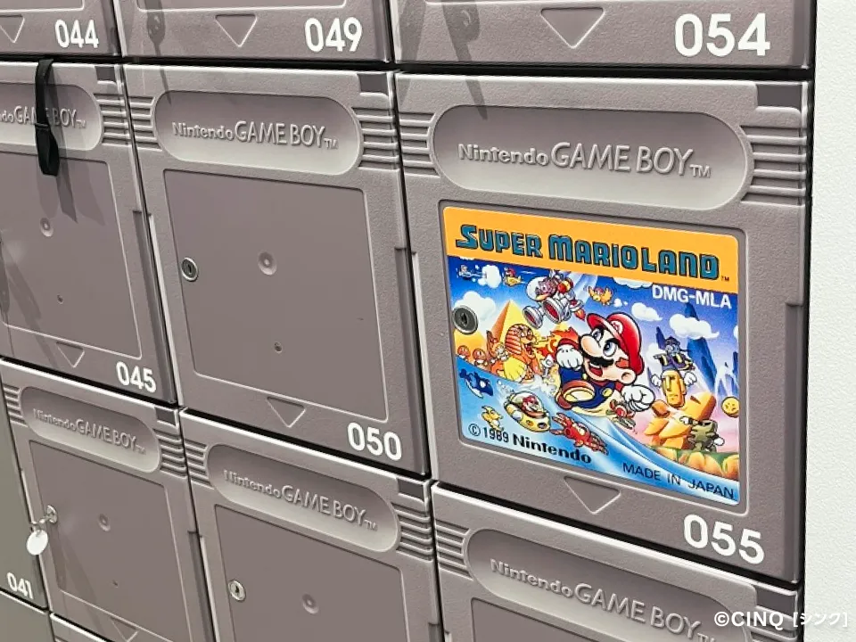 荷物の大きい方にはロッカーの準備もあります。ゲームボーイのソフトの形をした扉…いきなりワクワクします。いくつか、ゲームタイトルのイラスト入りのものもあったので探してみるのも楽しそうです。