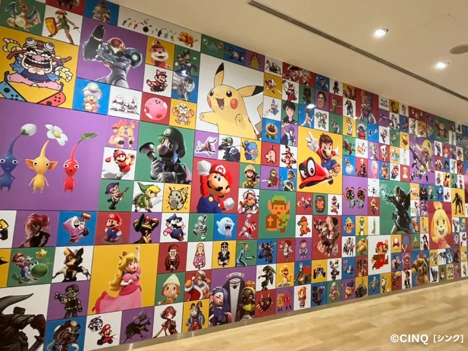 任天堂のゲームキャラクターたちがずらっと並ぶ壁面を眺められます。